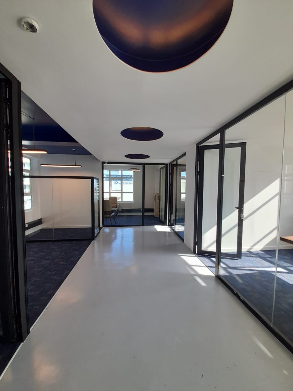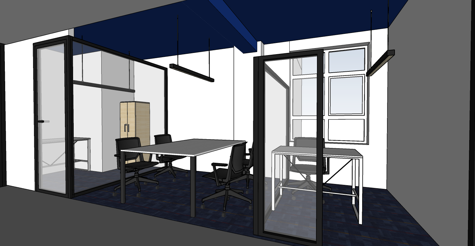 Since the aim here is not to compartmentalise the cubicles, we decided on the use of 8 mm laminated glass, which is framed with slim, matte black aluminium.