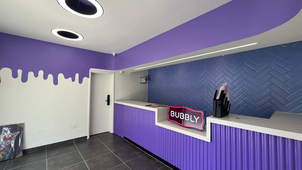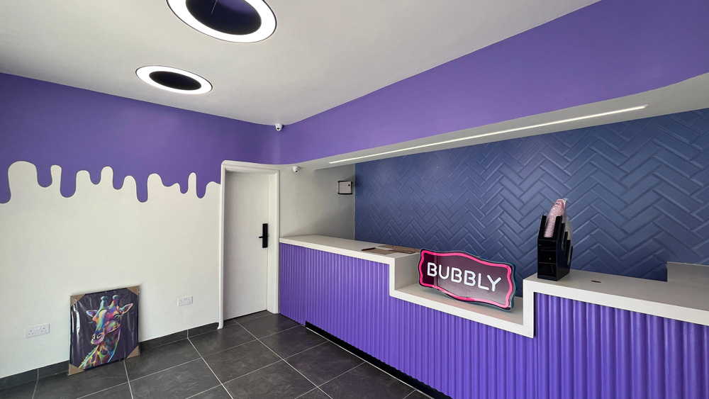 Screeded and painted walls create a clean, bright background that really highlights the branding colours.