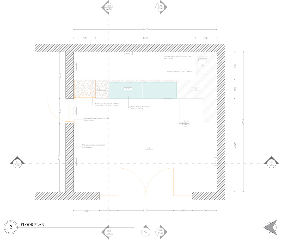 We designate the back-of-the-house areas, such as the kitchen entrance and the barista sink, to maintain the customer area as calm and well-organised.