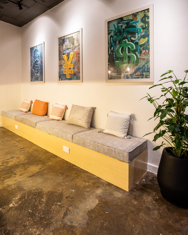 The color palette is a vibrant and bold mix of brand and natural design pieces. As part of our design, we strictly implemented the brand colors of FXPesa through sticker marketing on office walls and in some of the office phone booths.